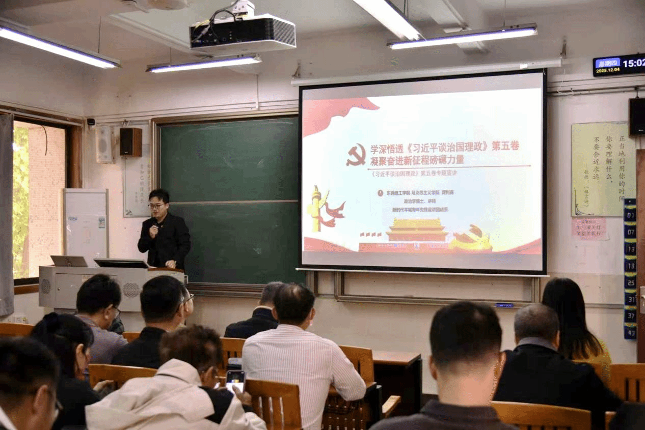 学习会上,龚利鑫博士系统解读了《习近平著作选读》第五卷的核心要义与实践要求,从理论逻辑、历史逻辑、现实逻辑三维度阐释了“现代化的本质是人的现代化”的深刻内涵,彰显了以人民为中心的发展思想在中国式现代化进程中的核心地位。他强调坚守人民至上理念、促进人的全面发展、保障人民共享现代化成果,是推进中国式现代化的根本立场与价值导向。紧接着,龚博士对《习近平谈治国理政》第五卷做了深入解读,重点围绕如何让新时代莞工人坚守读原著、学原文、悟原理的准则,将先进思想理论内化于心、外化于行并转化为驱动发展的强劲动力做了辅导宣讲。